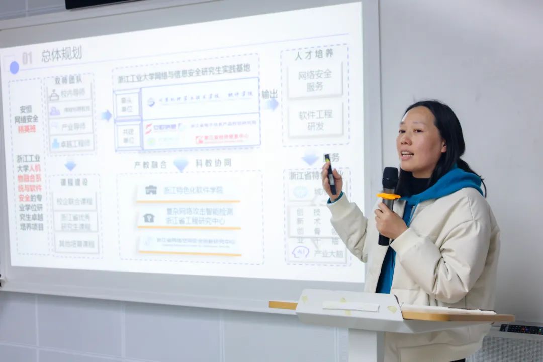 何玲娜则对学院校企合作的总体规划和具体路径作出详细阐述,介绍了浙江特色化软件学院的建设情况以及与安恒信息在产教融合方面的合作成果,并对安恒精英班、人机物融合系统与软件安全等项目的具体开展,介绍了学院向安恒信息人才输出的实例。