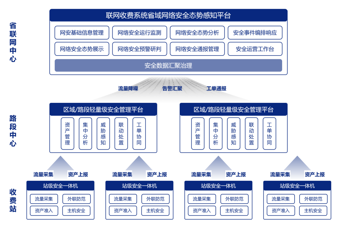 ❖区域/路段中心及ETC发行方建设与省中心态势感知系统级联的二级态势感知系统,负责本路段范围内路段中心及各收费站(ETC发行单位及发行网点)的网络安全风险感知与处置。