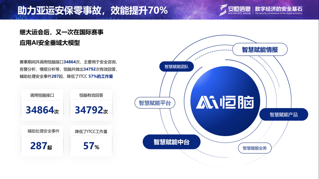 在本届杭州亚运会期间,该平台与恒脑·安全垂域大模型深度结合,实现了AI对AI的管理与运营,提升了安全运营效能70%以上。这一成就为确保亚运会的网络安全保障工作圆满完成、延续15年重保零事故的保障记录贡献了重要力量,代表着安全领域的新高度。
