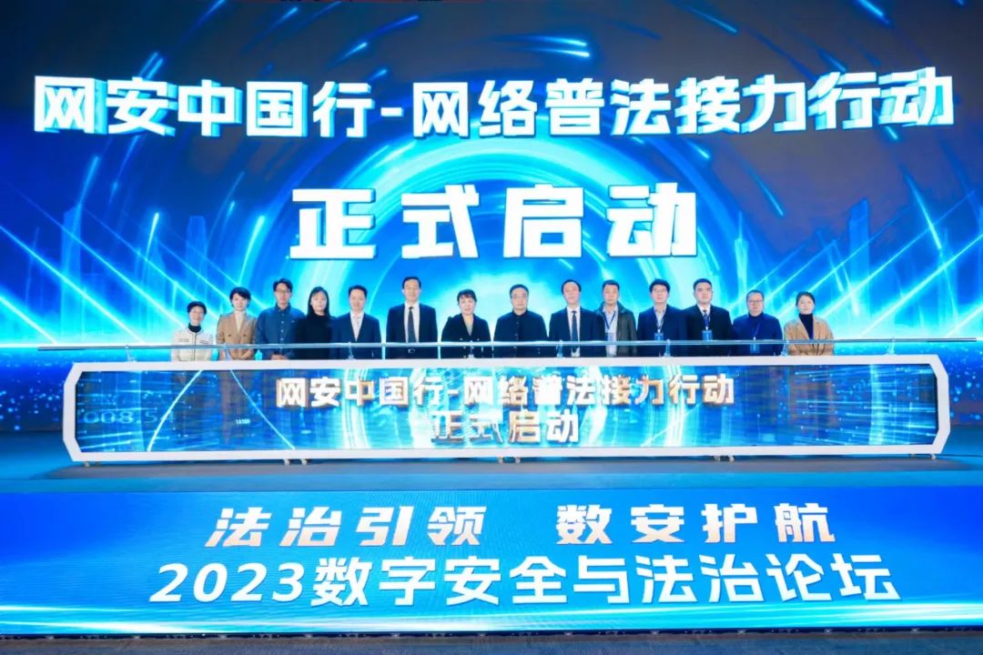 论坛现场,中央网信办法治局、中国网络安全协会、浙江省委网信办、杭州市委宣传部、杭州市余杭区政府与安恒信息等9家首批接力单位共同启动了“网安中国行——网络普法接力行动”。
