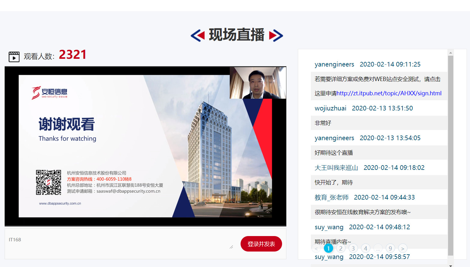 疫情当前,安全在线。为了保障在线教育系统安全,今日,安恒信息正式发布在线教育系统安全整体解决方案。与以往不同的是,这次发布会全部流程都是在线上进行,精彩的“直播+互动+答疑”形式也吸引了超过2000名观众参与。