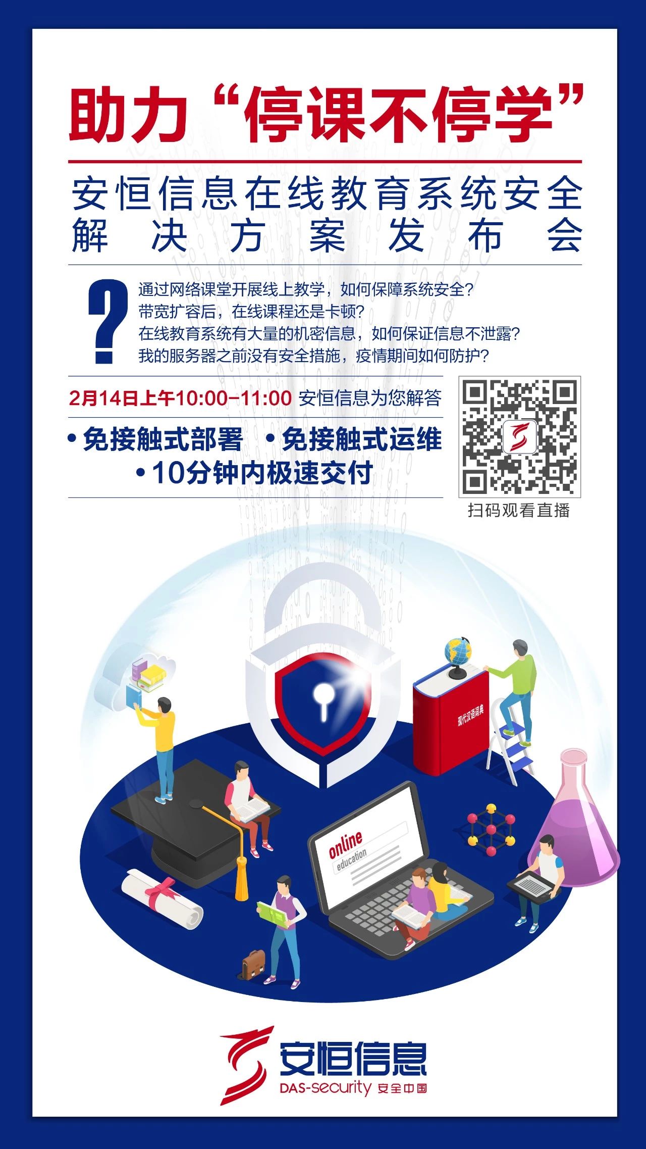 安恒信息基于教育机构的网络特性和行业沉淀,推出一体化的在线教育系统安全解决方案。由于疫情特殊时期,免接触、交付快、响应快的saas化安全解决方案成为当前的不二选择。