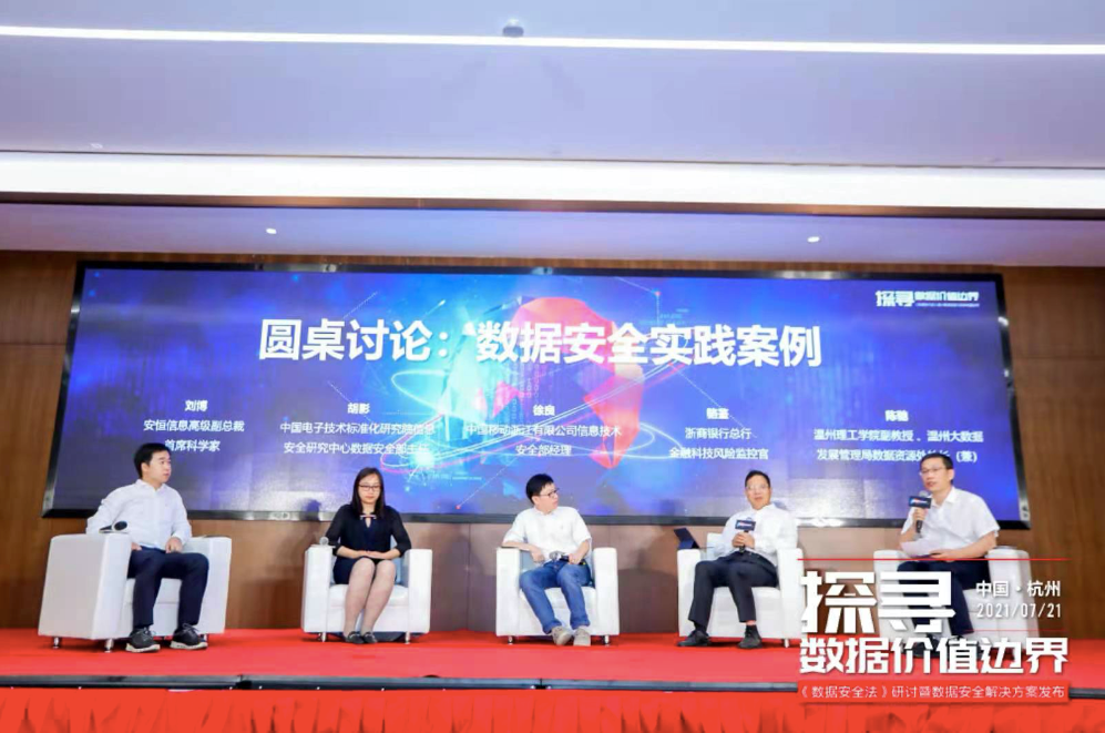 ▲ 从左到右依次为:安恒信息高级副总裁、首席科学家刘博;中国电子技术标准化研究院网络安全研究中心数据安全部主任胡影;浙江移动信息技术部安全室经理徐良;浙商银行总行金融科技风险监控官骆鉴;温州理工学院副教授、温州大数据发展管理局数据资源处处长(兼)