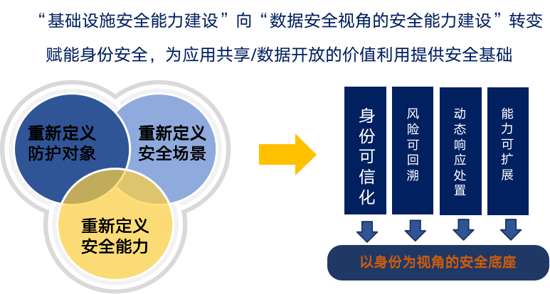 零信任并不是要颠覆等保2.0、纵深防御体系,而是互补关系。零信任以身份为新边界,意味着首先要改变的是仅依赖安全设备在网络边缘保护所有系统和资源的情况,需要在用户现网的架构中,重新定义防护对象、新业务安全场景、并交付新的安全能力。我们要根据系统本身的安全策略、业务敏感度、安全等级特征等因素,建立新的身份边界。这里的“身份”不仅是用户的身份,还要考虑访问主体和客体的身份(如设备、应用等)、原有的网络的身份等。可以看到,我们并没有摒弃传统的以网络为安全边界的理念,而是又叠加了多维度的身份信息,以软件定义的方式构建以身份为边界的新安全模式。