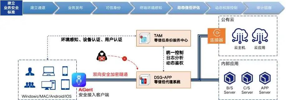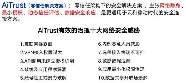 安恒信息依靠多年的技术沉淀和秉持创新精神,推出AiTrust零信任解决方案,该方案取代了以边界为中心的安全架构,它可确保根据身份、设备和用户环境动态实施安全和访问决策。只有经过身份验证和授权的用户和设备才能访问应用程序和数据。精准交付网络隐身、最小权限、动态信任评估及数据安全保障等多项安全能力。