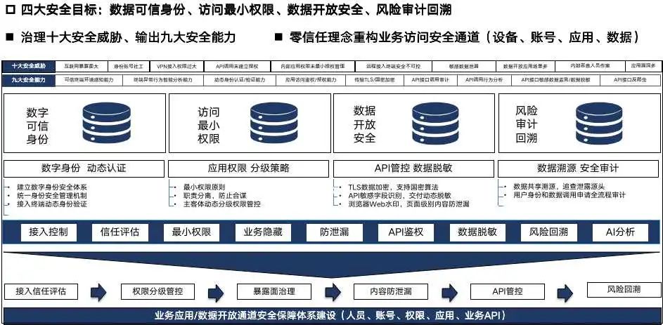 安恒信息一直致力于数据安全治理领域的产品研发和创新,我们自己也定义了自己的零信任能力框架。主要纬度是四个核心安全目标,数据可信身份、访问最小权限、数据资产保障、数据风险回溯。打造一套业务应用/数据开放共享通道的安全体系平台,交付给用户更可信的用户身份(基于多因子和多种属性,实现全面用户身份认证)、更安全的业务访问(采用细粒度、动态化的授权模式,安全策略策略更实时有效)、更全面的安全考量(集合环境、访问行为、风险事件等多元素构建访问策略)。
