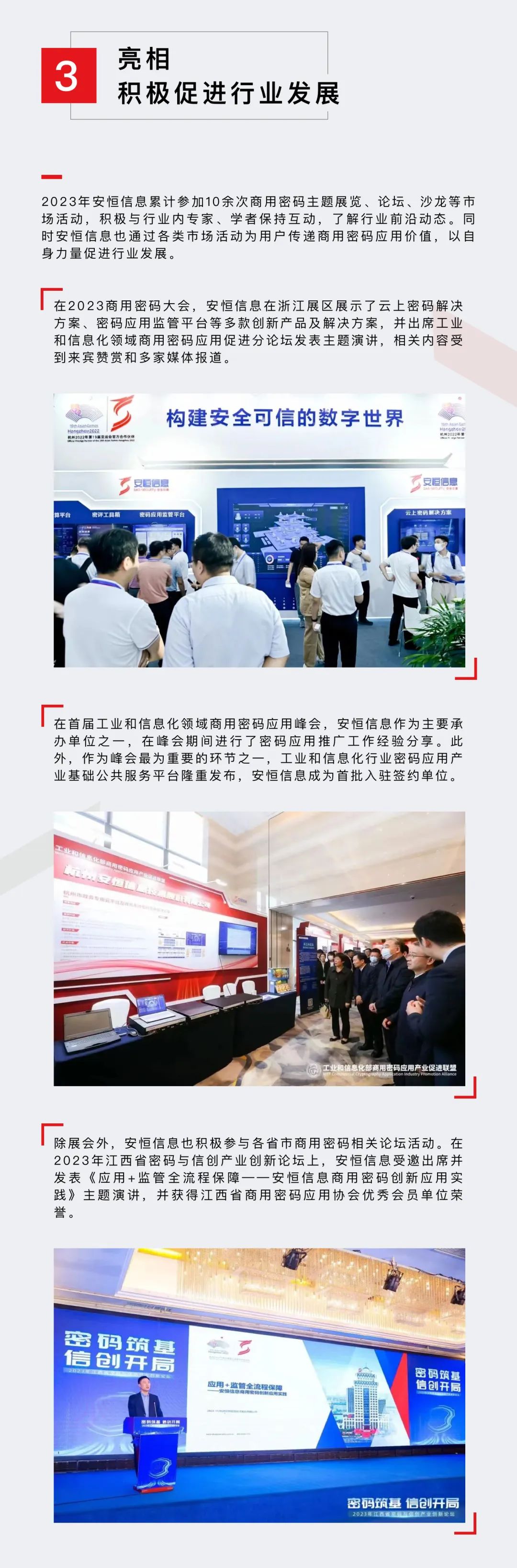 回首2023收获满满,其中离不开广大客户的信任与合作伙伴的陪伴。展望2024未来可期,安恒信息将持续在商用密码领域发力,通过更优质的产品及服务为各行业用户夯实密码安全底座,为商用密码应用水平和行业发展做出更大贡献。