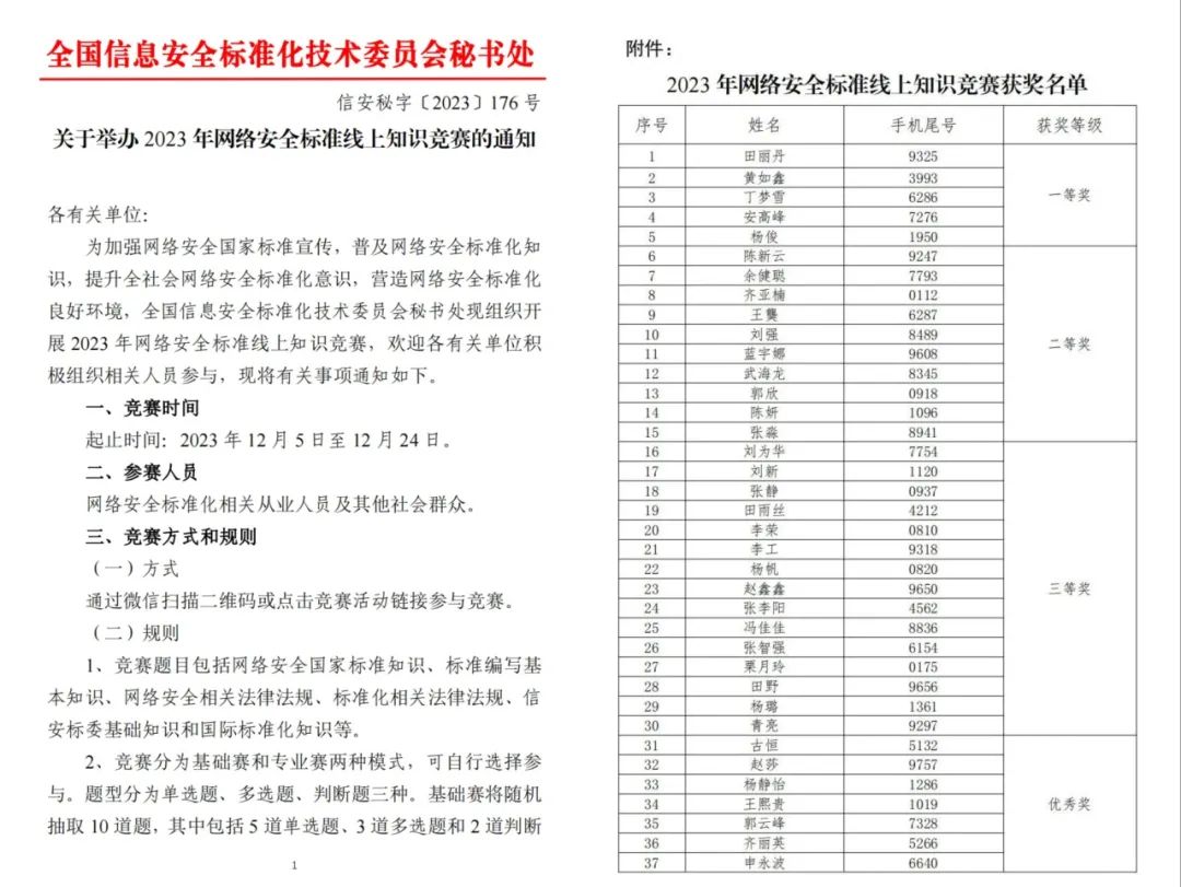 1月10日,在全国信息安全标准化技术委员会组织开展的2023年网络安全标准知识竞赛中,安恒信息田丽丹作为企业代表参赛并获得一等奖。