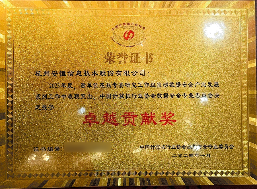 安恒信息获中国计算机行业协会数据安全专业委员会“卓越贡献奖”