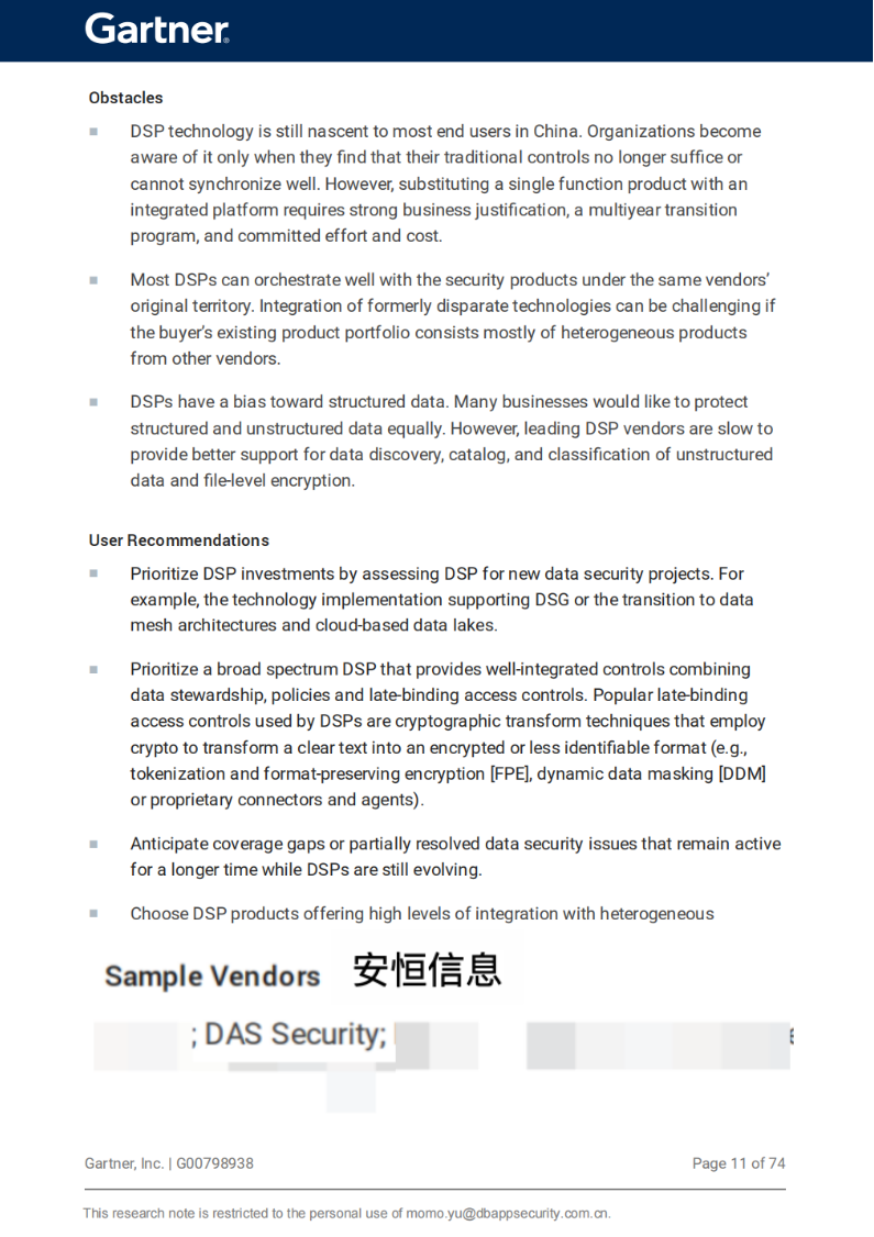 ➣安恒信息连续两年被Gartner报告列为“数据分类分级领域”领跑厂商