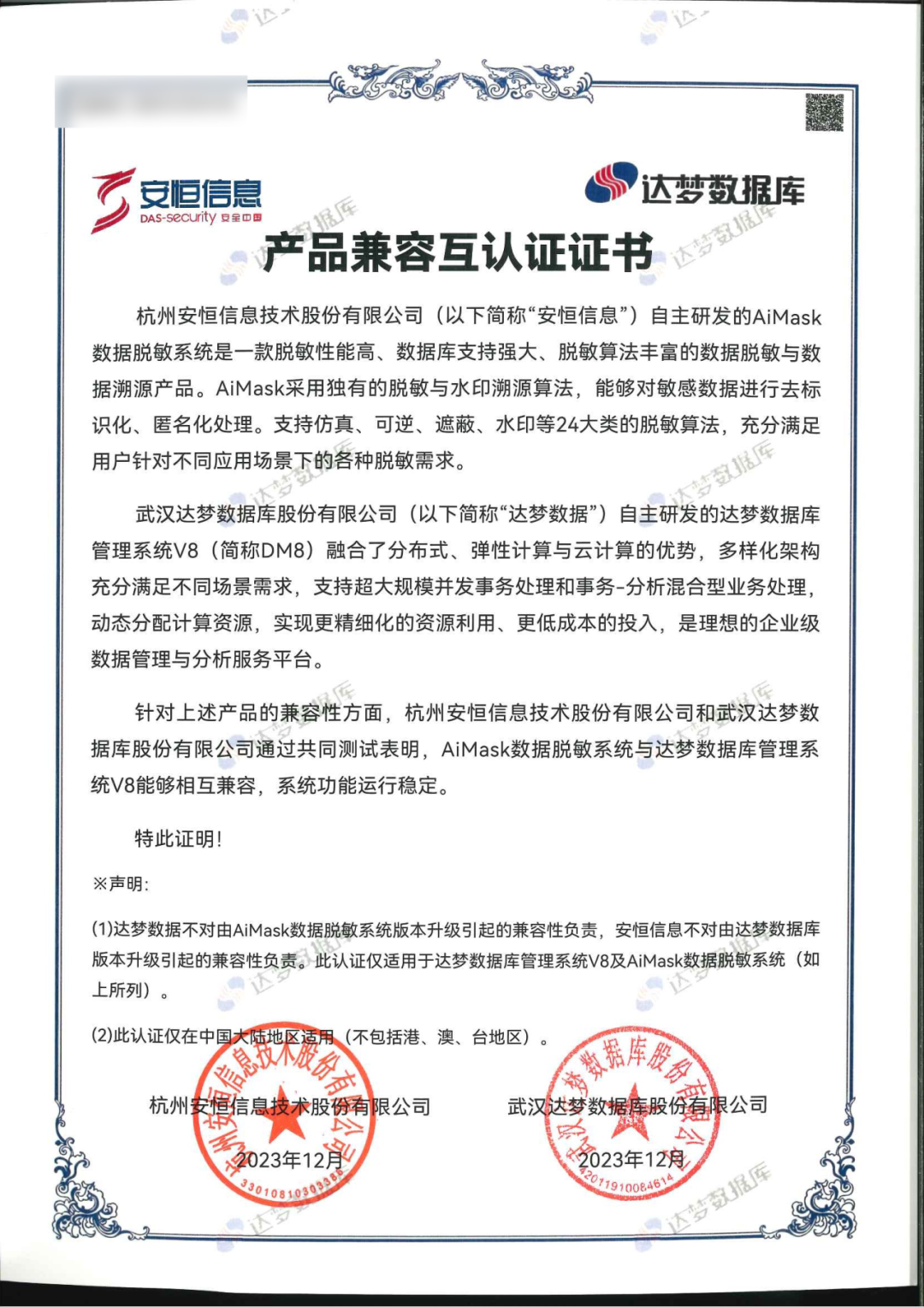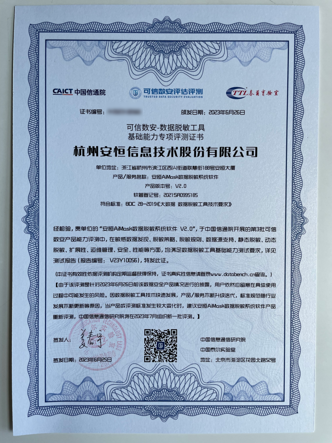 1. 通过信通院《数据脱敏能力检测》(2023)