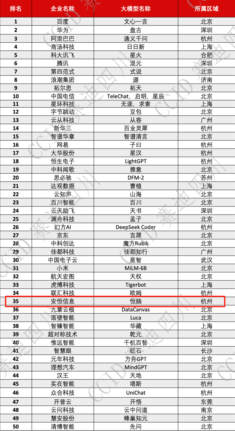 “安恒恒脑”入选中国AI大模型综合竞争力50强