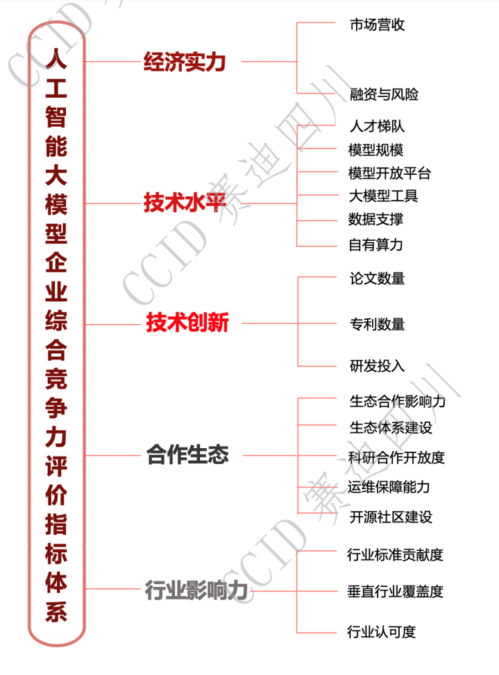 《2023中国人工智能大模型企业综合竞争力50强研究报告》对企业在人工智能大模型领域的竞争力进行多维度评价,综合考虑企业经济实力、技术水平、技术创新、合作生态、行业影响力5个一级指标,市场营收、融资与风险、模型开放平台等19个二级指标,最终形成企业在人工智能大模型领域的竞争力综合评价指标体系,如下图所示。