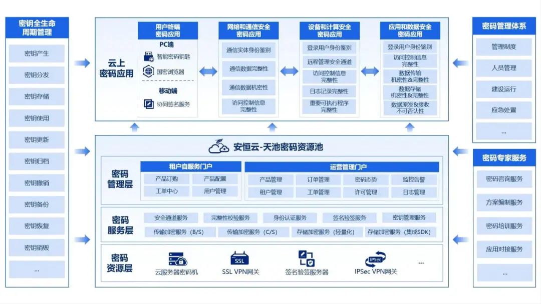 随着《中华人民共和国密码法》、《商用密码管理条例》等多项法律法规的出台颁布,商用密码建设成为业界普遍关注的重点。当前云计算已经成为各行业数字化转型的重要基础设施,然而云计算资源共享、弹性灵活的特点对以硬件形态为主的密码产品带来了新的挑战,因此亟需针对云环境下的商用密码解决方案,满足业务上云后的商用密码应用与合规需求。
