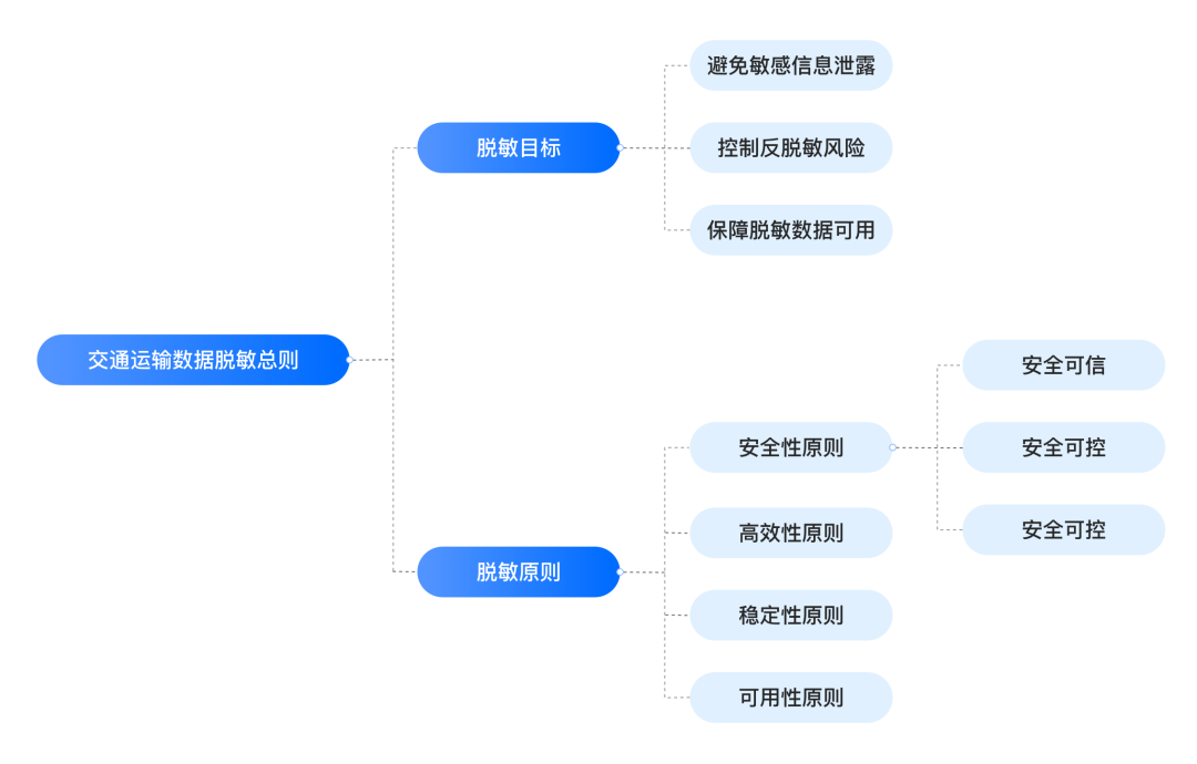 本标准对交通运输数据脱敏进行明确定义,基于国家对数据脱敏产品相关要求和数据脱敏的实际应用需求确立了包含3项数据脱敏目标和4项数据脱敏原则的交通运输数据脱敏总则。