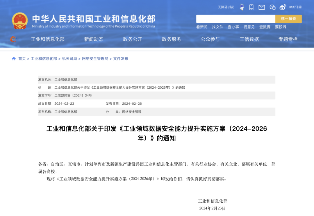 工业和信息化部近日印发《工业领域数据安全能力提升实施方案(2024—2026年)》(工信部网安〔2024〕34号),(以下简称《实施方案》)提出到2026年底,我国工业领域数据安全保障体系基本建立。提出到2026年底,我国工业领域数据安全保障体系基本建立。