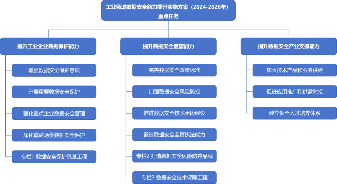 工业企业是履行数据安全保护责任和义务的主体。《实施方案》重点明确了提升工业企业数据保护能力的四项关键举措:
