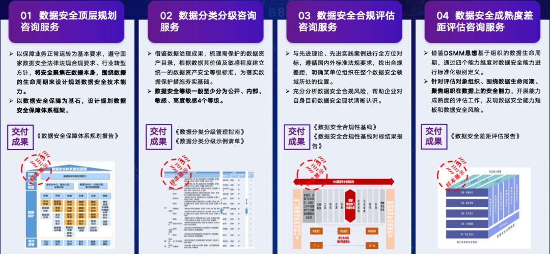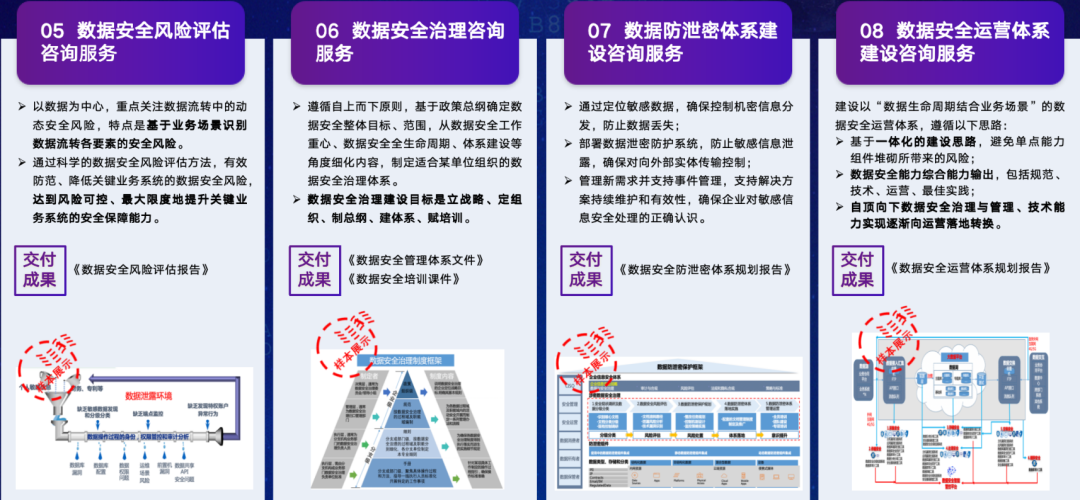 数据安全咨询服务体系目前囊括八大类核心服务:数据安全顶层规划、分类分级、合规评估、DSMM差距评估、风险评估、治理咨询、防泄密体系、运营体系设计咨询服务;