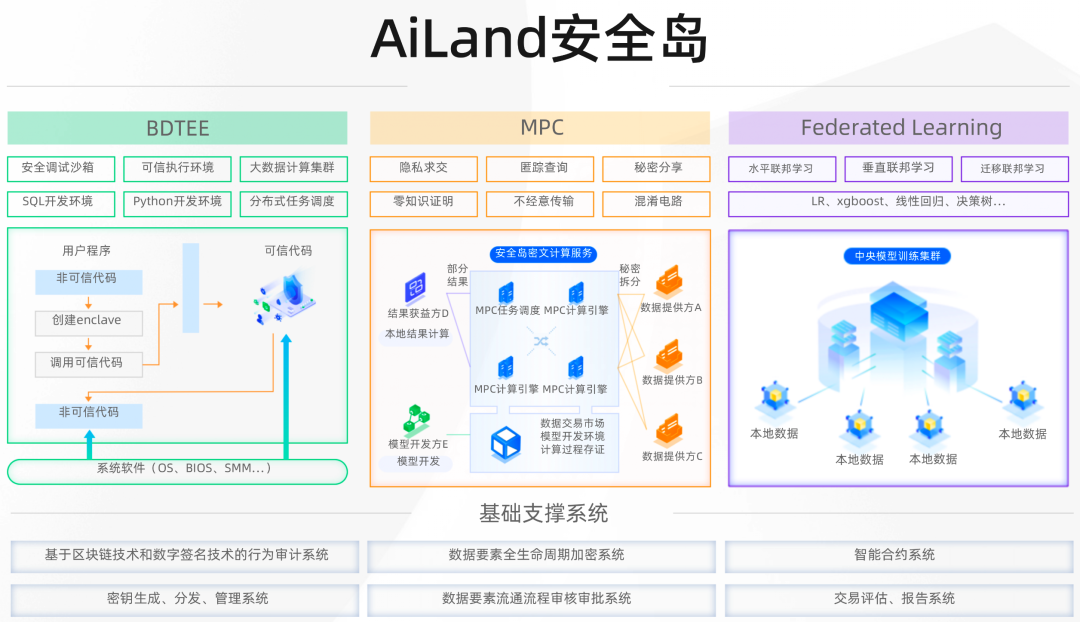 安恒AiLand数据安全岛隐私计算平台是一个专注于保障数据安全流通,致力于解决多源多方数据联合建模分析时的安全、信任和隐私保护问题的隐私计算平台。综合应用可信执行环境,联邦学习,MPC,同态加密等多种前沿技术,配合关键行为数字验签和区块链审计技术,实现数据要素流通的所有权和使用权分离,确保原始数据的“可用不可见”、“可用不可取”,保障多方数据联合计算过程的可靠、可控和可溯。平台目前服务于大数据交易中心、政务数据授权运营、公安大数据开放共享、东数西算工程等项目,获得多方好评。