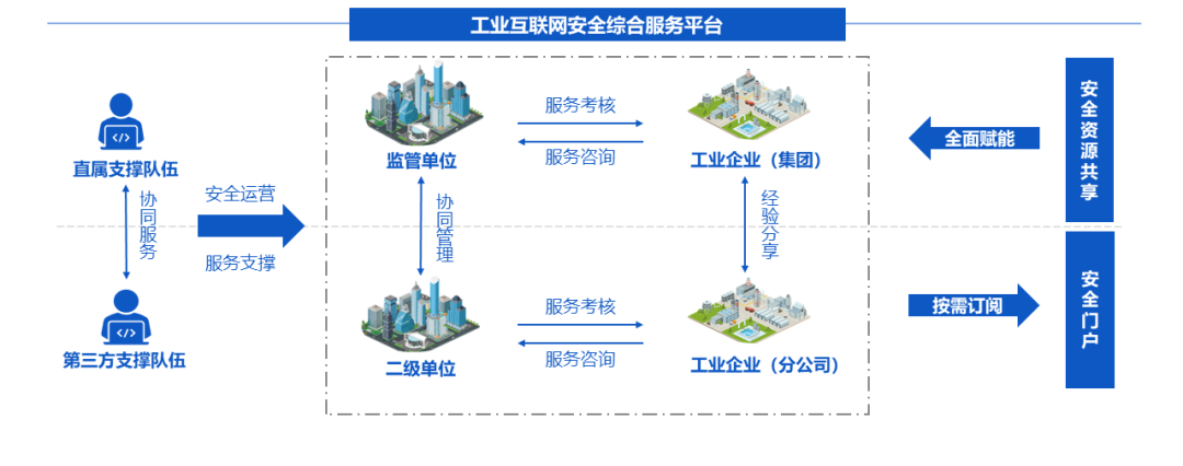 将工业互联网安全“监测预警与协同应急管理”、“工业互联网企业安全合规管理”和“工业互联网安全支撑综合服务”三大业务应用融为一体,以“工业互联网安全公共服务”为核心能力,为区域工业互联网安全主管部门和工业企业提供“双向赋能”,打造服务于工业企业的省、市工业互联网安全公共服务生态体系,逐步形成集约化工业互联网安全运营服务中心。