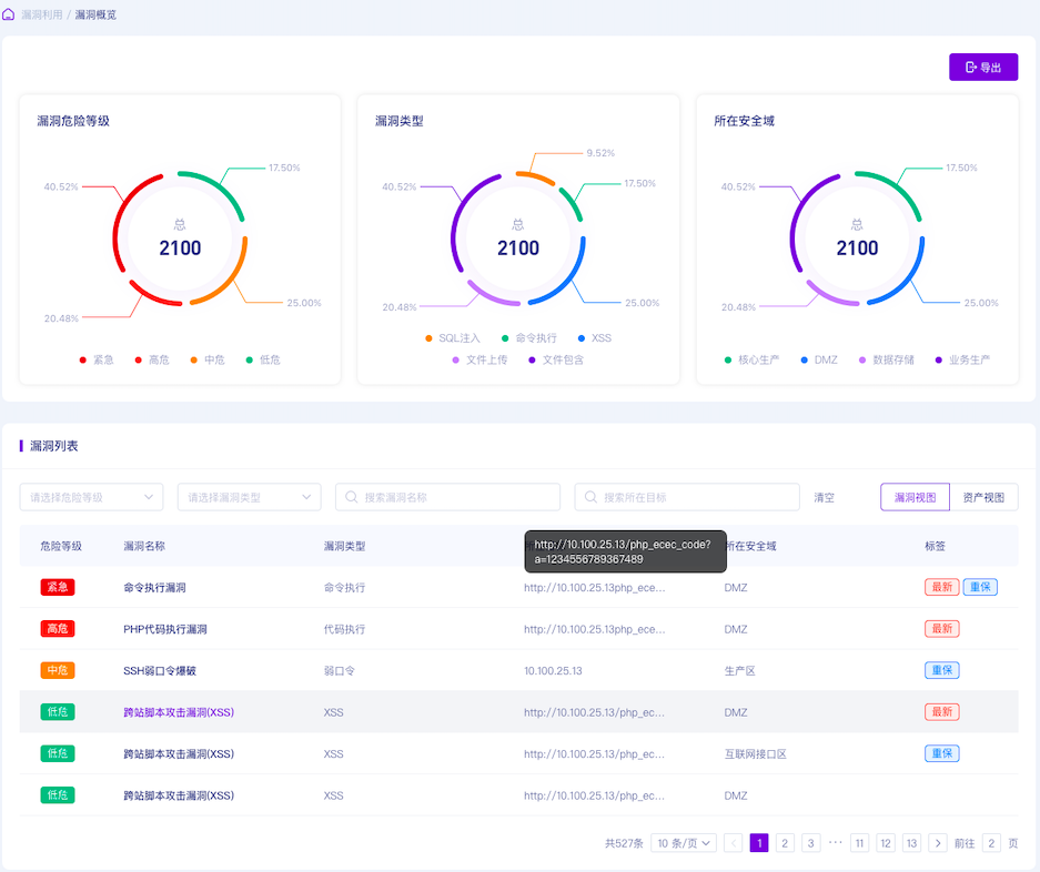 可利用漏洞验证评估采用漏洞利用攻击模拟技术,无损验证资产上可被利用的漏洞,漏洞POC覆盖web应用、操作系统、编程语言框架、最新热点漏洞等。通过提供多个漏洞利用验证场景,基于资产指纹自动适配漏洞验证POC,精准、高效验证资产可利用漏洞,并对漏洞风险进行多维测绘,实现资产可利用漏洞聚焦排查。