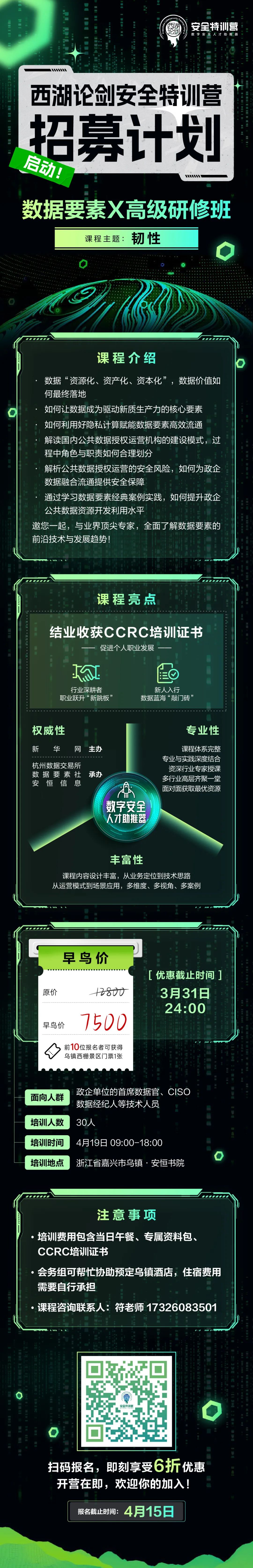作为国内领先的数字安全人才交流、孵化及实训平台,2024西湖论剑·安全特训营将依托乌镇安恒书院安恒信息长三角数字人才创新实训基地等优势,以培养高水平复合型数字人才为目标,围绕“数据要素”与“人工智能”两大热门方向 ,开设“数据要素X高级研修班”与“AI新质生产力-大模型认知与应用能力提升班”,持续为培养数字安全人才提供强有力的“燃料”,助力数字中国新型人才队伍建设。