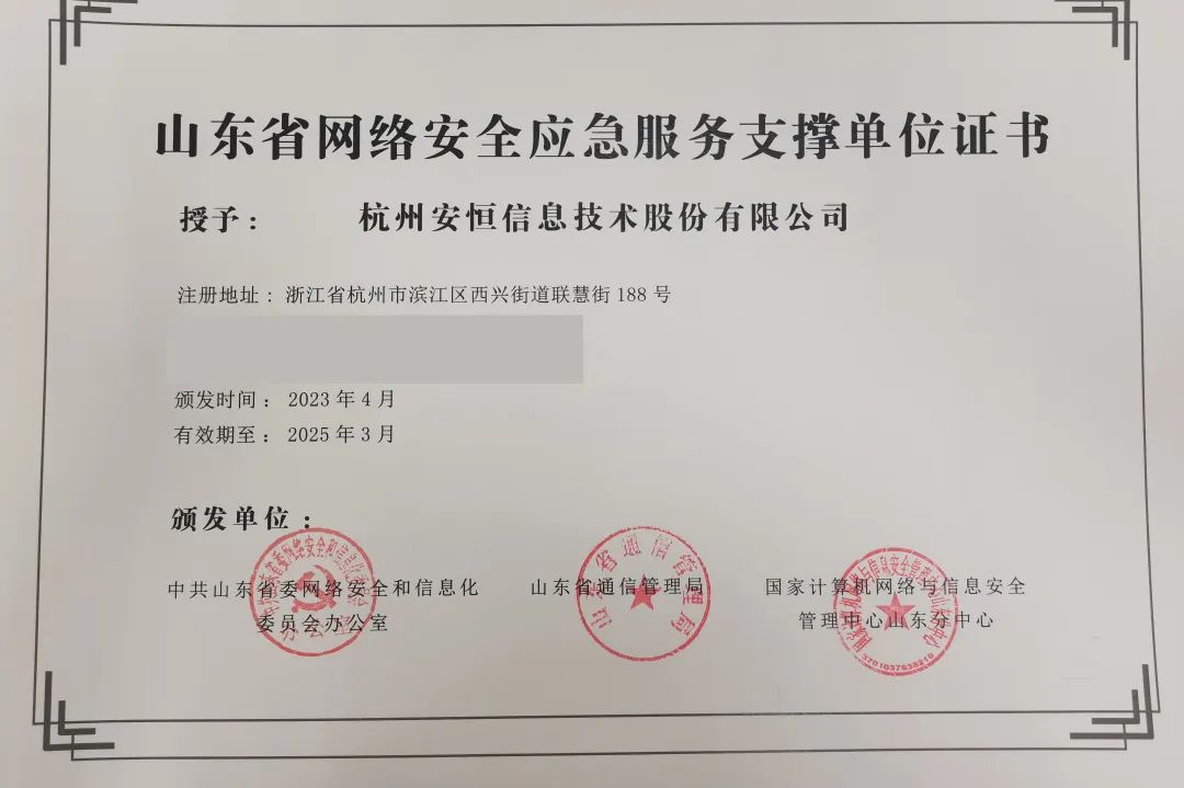 此前,安恒信息也成功入选国家互联网应急中心CNCERT公布的第十届CNCERT网络安全应急服务支撑单位甲级名单,实现了连续五届获得CNCERT网络安全应急服务支撑单位证书。