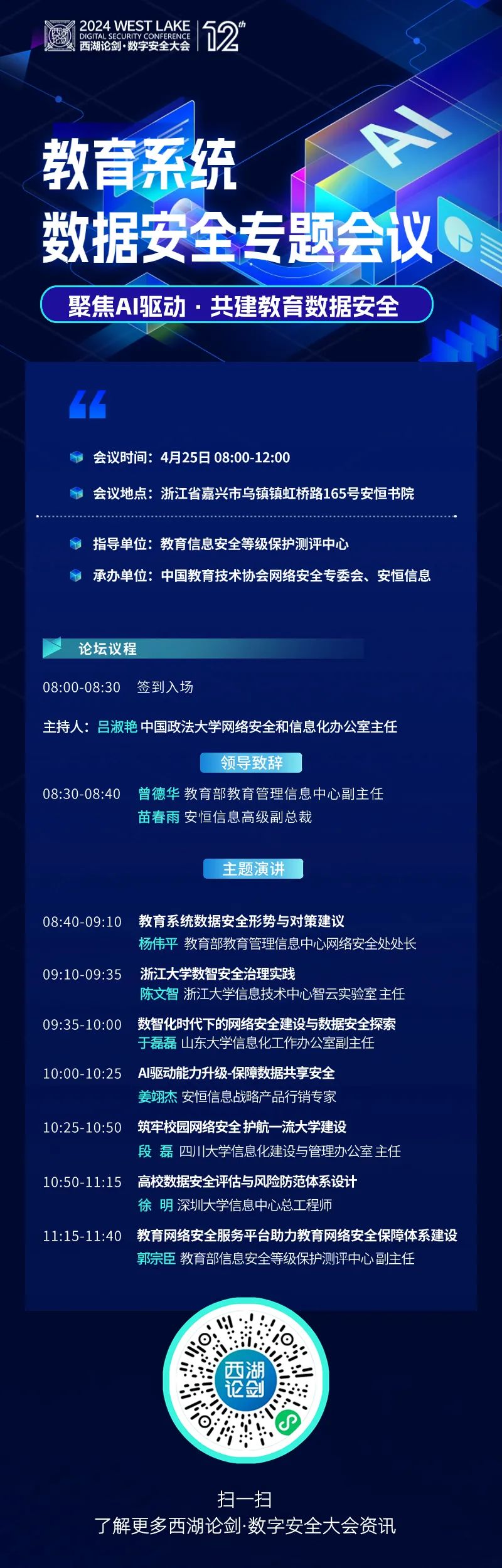 4月25日,2024西湖论剑·数字安全大会首场专题会议——教育系统数据安全专题会议,在乌镇安恒书院举行。议程请查收