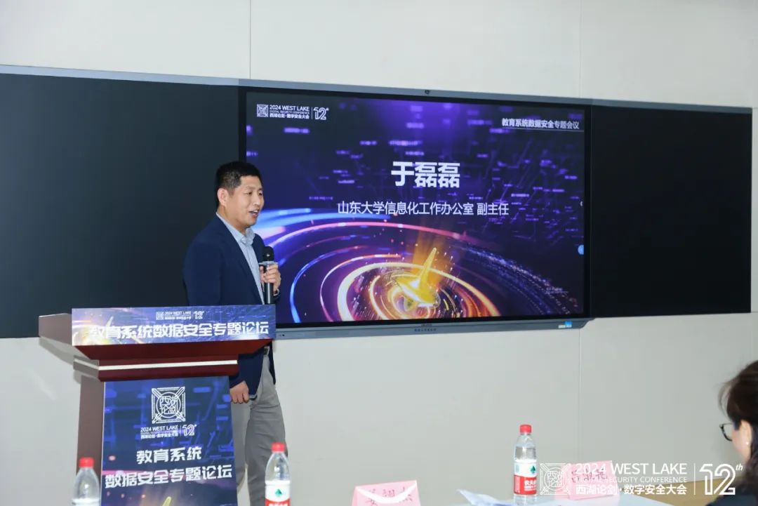 山东大学信息化工作办公室副主任于磊磊作了《数智化时代下的网络安全建设与数据安全探索》主题分享。他首先分享了网络安全组织、网络安全工作、网络安全技术保障、网络安全应急响应、网络安全素养提升的“五位一体”山东大学网络保障安全体系。在数据安全保障模式的探索中,山东大学管理和技术网络两手抓,以数据分类分级保护为基本原则,扎实推进全生命周期安全保护路线。此外,于磊磊还分享了实践中以及人工智能应用安全的多点思考。