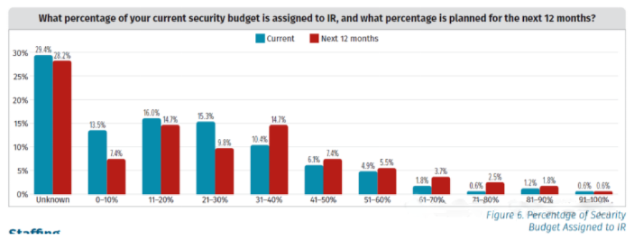 随着攻击手段的不断演进,国内外单位遭受无差别网络攻击日益频繁,应急响应(IR)自然成为单位网络安全建设过程中的一个重要方向。以SANS发布的《2023IncidentResponse》报告中数据为例,大部分预算清晰的受访者表示IR预算占整个安全预算在30%以内,体现了单位对IR非常重视。