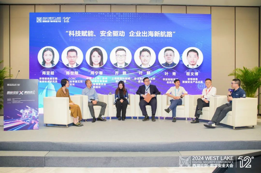专题会议的最后,由安恒信息副总裁、首席标准研究员周亚超主持,中国网络安全审查认证和市场监管大数据网络安全审查五处处长陈世翔,中国(上海)自由贸易试验区临港新片区数据处周宁馨,上海临港科技城副总经理乔鹏,卧龙集团工业互联数智副总裁CDO叶麟,平安财险浙江总经理叶青,安恒信息数据安全产品总监程文博共同以“科技赋能、安全驱动,企业出海新航路”为主题进行圆桌对话,畅谈了数据出海流通的新思维、新方向。与会嘉宾指出,在经济全球化、数字经济浪潮叠加的今天,数据出海已经成为大势所趋,要满足数据出海的合规化要求,需要遵循法律法规的明确准则,并推动数据安全技术的创新,构建服务于数据出海的数据安全工具体系,确保在全球化运营中数据流动的顺畅与安全。