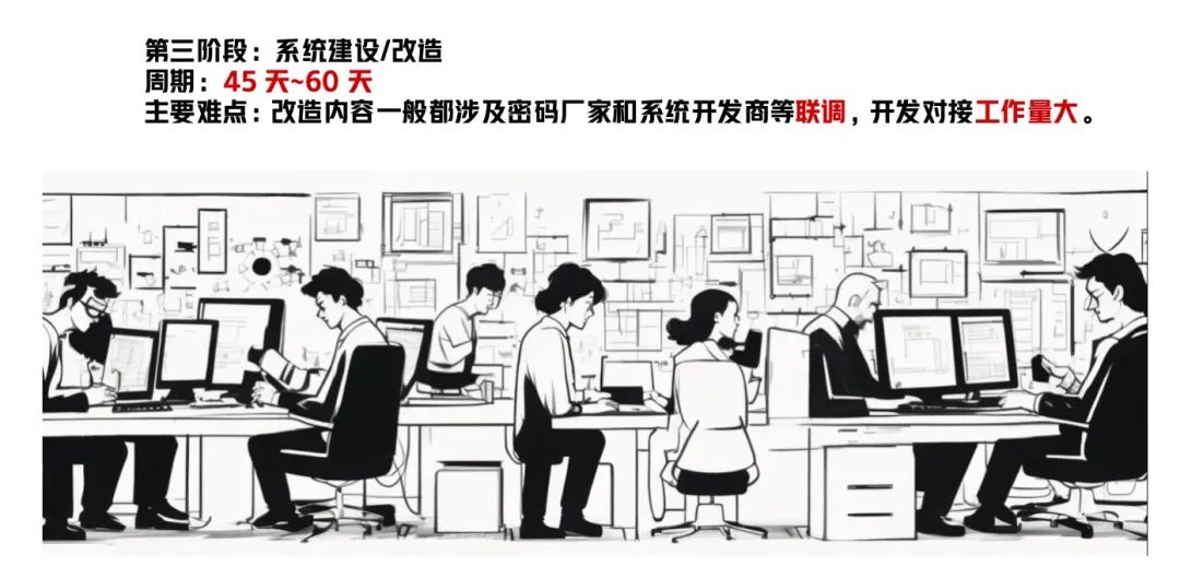 应用系统需要按照密码应用方案的内容进行系统改造联调,身份鉴别、存储完整性等改造难度大。