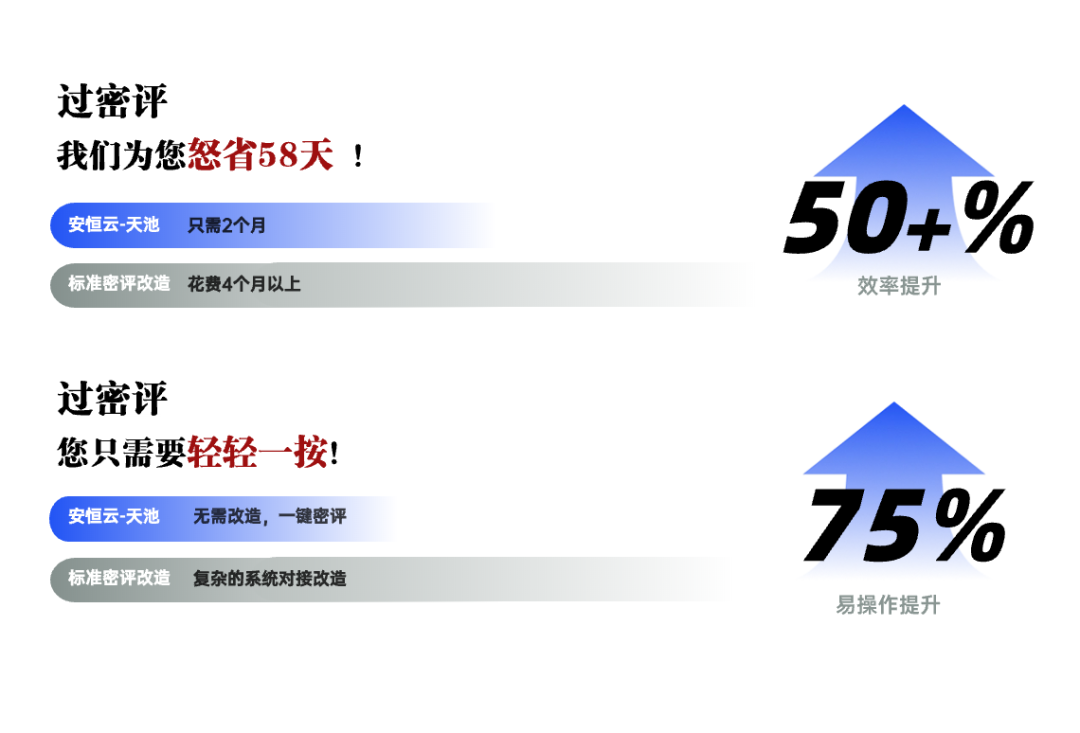 某运营商客户,两部委考核需要完成内部1个业务系统密评改造,改造时间只有2个月左右,时间紧任务重,在此背景下,选用客户已经采购的安恒云-天池作为密评对象,通过“一键密评”如期完成了密评改造。
