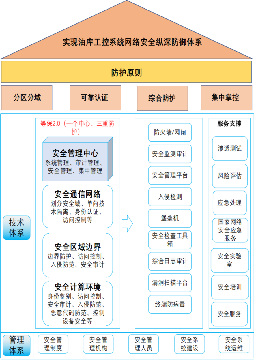 围绕“一个中心三重防护”策略构建基础防护平台,通过安全计算环境防护, 实现油库工控系统的工业主机、服务器、操作站、工业应用软件等计算环境安全防护;