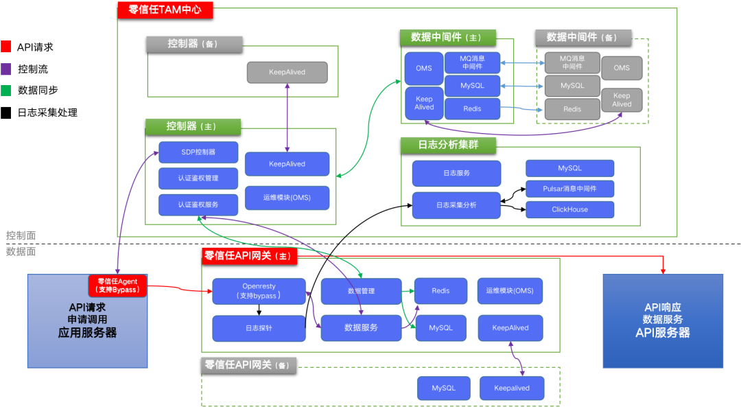 除此之外,在可靠性方面,API终端和API网关增加了Bypass机制以及服务健康自检机制,一旦系统发生故障,立即做适当放行处理,避免造成正常业务中断,整体的部署模式如下所示。