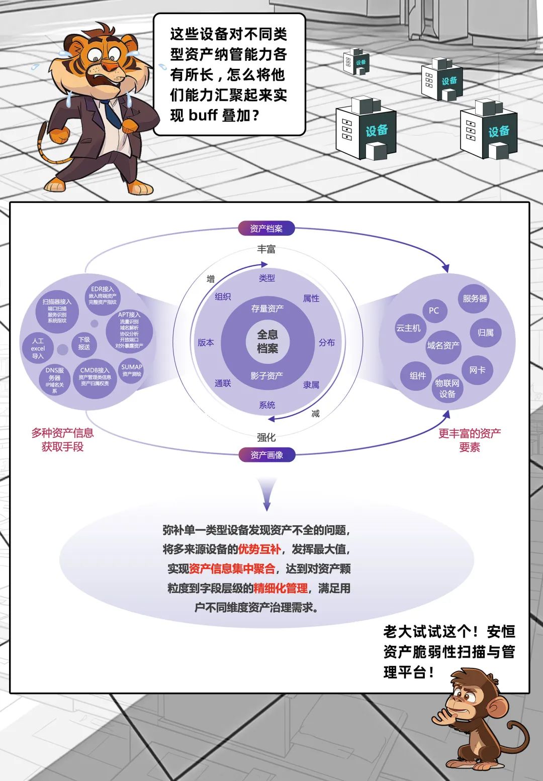 老王最近很郁闷,作为企业网络安全负责人,近期盘点企业资产时发现,虽然企业内部署了很多安全和网络管理设备,但设备间信息隔离,各自为战,造成资产管理分散、不同来源数据冲突,严重影响了企业整体运营效率,增加了安全风险管理的复杂性,使得潜在的安全威胁难以被及时发现和处置,从而可能给企业带来重大的安全隐患。