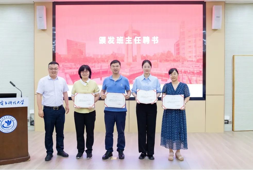 杭州电子科技大学教务处副处长郑鹏(左一)、 杭州电子科技大学副校长周青(左二)、安恒信息高级副总裁冯旭杭(右二)、安恒信息浙江教育行业负责人彭实(右一)共同为安恒班揭牌