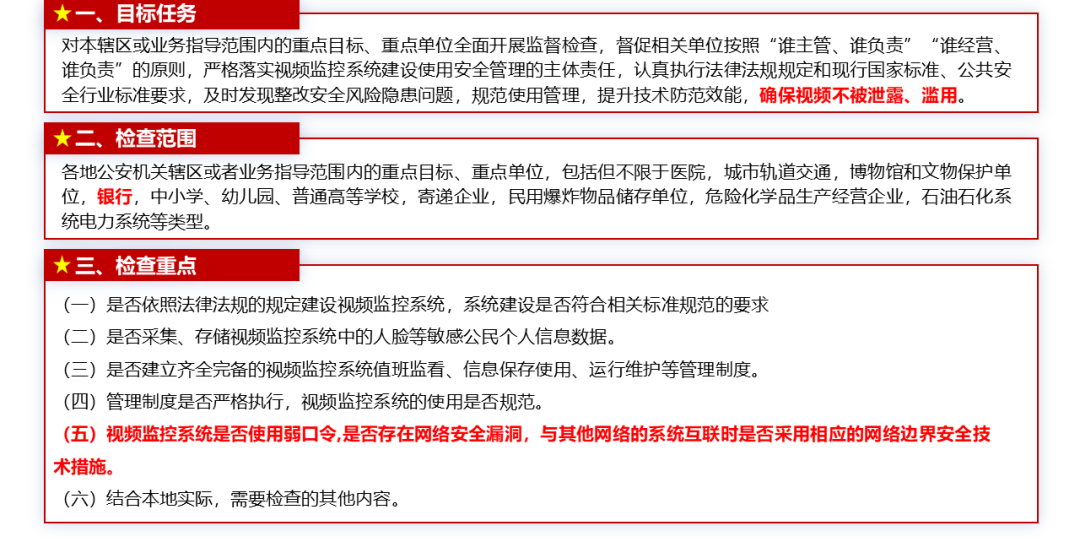 2024年1月,公安部下发布了《关于开展防范恐怖袭击重点目标治安保卫重点单位视频监控系统隐患排查整改攻坚工作的通知》。通知中明确各地银行是检查重点单位,其次视频监控弱口令与漏洞、边界安全是检查重点。详情如下图:
