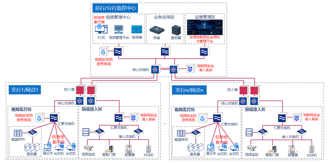 基于上述背景与政策要求,安恒信息基于物联资产识别、脆弱性监测、违规外联监测、视频数据防泄漏等核心技术,提供金融安保网检测、防御、分析一体化物联安全解决方案。