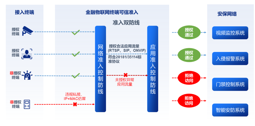 通过视频安全准入系统,依托资产IP、MAC地址、通信协议、安全脆弱性等多因子准入机制,保障仅合法物联终端才能接入网络中,在感知层实时保障物联网终端接入安全。