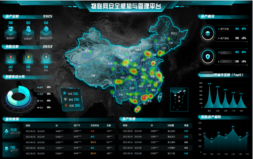 通过部署安恒金融物联网安全解决方案,可以通过物联网安全感知与管理平台实时监测全网物联资产数据、业务数据、交易数据、安全风险数据等信息,帮助用户实现物联资产、风险可视化,有效降低物联网终端安全风险,辅助提升用户业务决策效率。