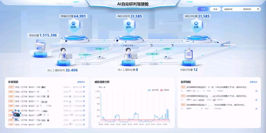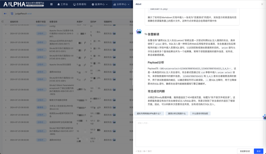 最新版的AiLPHA安全分析与管理平台+恒脑堪称安全运营必备单品。不仅能针对海量告警进行分析研判,形成主动攻击研判分析、威胁情报回连分析、攻击者视角分析等结论,还能针对告警内容,提取告警处置要素,提出告警处置建议,根据自然语言转换成为产品联动指令,完成告警快速处置闭环。