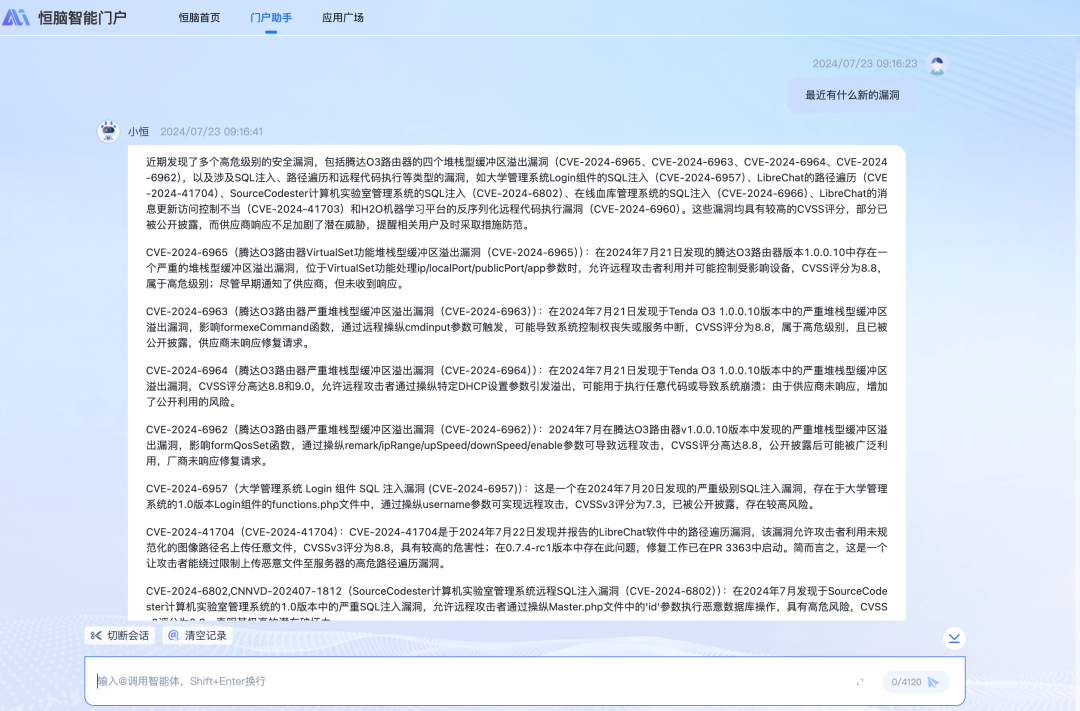 问问小恒(恒脑·智能门户)就能及时获取并理解新漏洞的详细信息,包括影响范围、攻击向量和缓解措施,可以加速响应速度,增强防御策略,提升整体安全态势,降低被利用的风险。