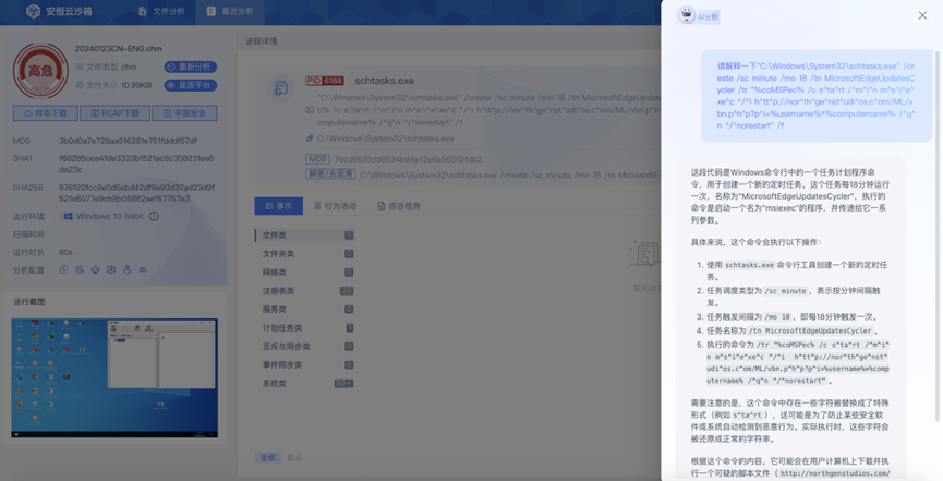 加上和恒脑联动,安恒云沙箱具备对指令、注册表等进行解释理解的能力,通过这种方式,可以降低对代码的理解门槛,并能够更深入地了解恶意软件的行为。