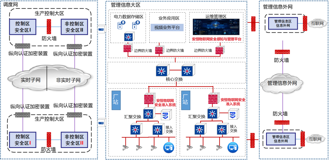 整体解决方案由2大核心组件构成。一是部署运维管理区的物联网安全感知与管理平台,实现整体观看;二是在厂站的汇聚交换机旁路部署安恒物联网安全准入系统,实现物联资产识别、弱点检测、异常行为检测,同时构建严格的物联资产准入管控机制。