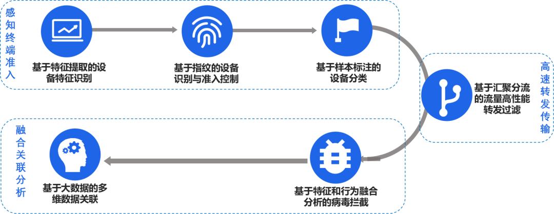 基于快速采集物联终端的IP、MAC、系统信息、类型等信息生成唯一指纹,对物联网终端进行指纹识别,对指纹信息错误的物联终端实时阻断并告警;对物联终端进行实时管控,确保所有接入终端的安全可靠