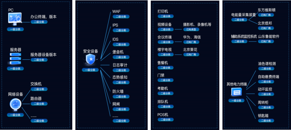 电力IOT网络中的终端数量非常多,有打印机、考勤机、智能运检、在线监测、电缆监测、车辆识别、变电站巡检、视频监控、电缆监测、变电站集采等类型繁杂且广泛分布在外场环境,另外,终端扩建、更换较为频繁。在此背景下,依靠人力进行资产梳理和建档管理难度较大,依靠常规扫描产品由于缺乏相关指纹积累,无法识别电力专网内特有的终端,由此形成一个电力资产测绘难的局面。