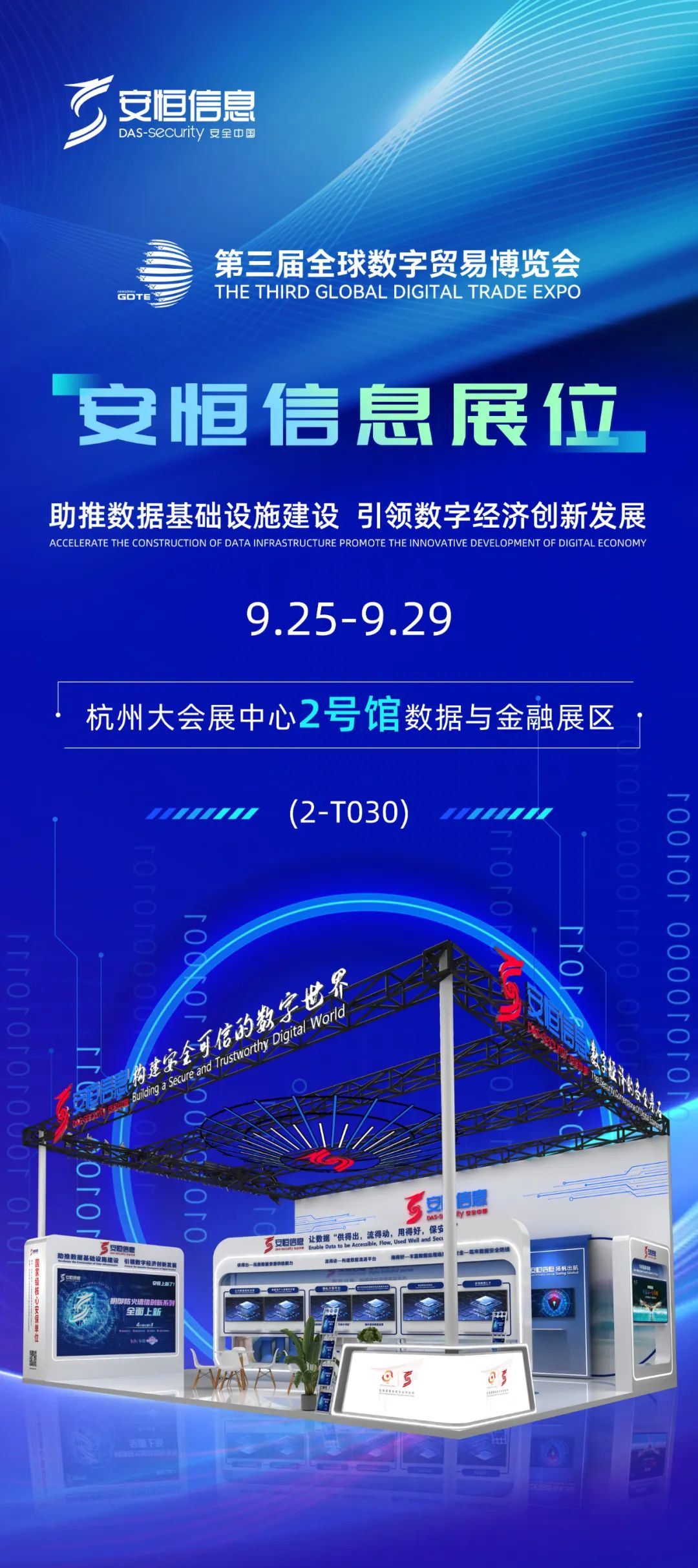 2024年9月25日-29日,第三届全球数字贸易博览会(以下简称“数贸会”)将在杭州举办。安恒信息将全面参与本次大会,并亮相多个环节。现场,在展览区,安恒信息设置了主题为“助推数据基础设施建设,引领数字经济创新发展”的主题展区。在今年的展区上,将结合最新技术,采用有趣、新颖的互动形式,为来宾提供全新体验!现在,让我们快来一起看看吧!
