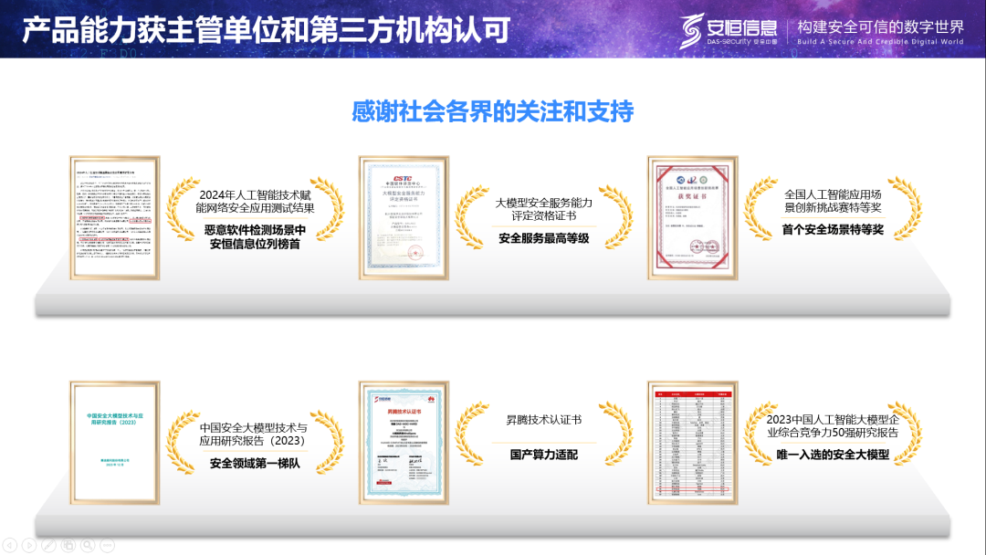 自2023年8月,恒脑安全垂域大模型发布以来,安恒信息在AI+安全上进行了大量的有益尝试和实战探索,并收获了诸多令人振奋的成果。他们曾斩获全国人工智能应用场景创新挑战赛特等奖,取得大模型安全服务能力评定资格证书、昇腾技术认证书,在2024年人工智能技术赋能网络安全应用测试结果恶意软件检测场景中位列榜首,并入选《中国安全大模型技术与应用研究报告(2023)》、《2023中国人工智能大模型企业综合竞争力50强研究报告》等第三方机构评测报告,始终占据安全领域第一梯队。