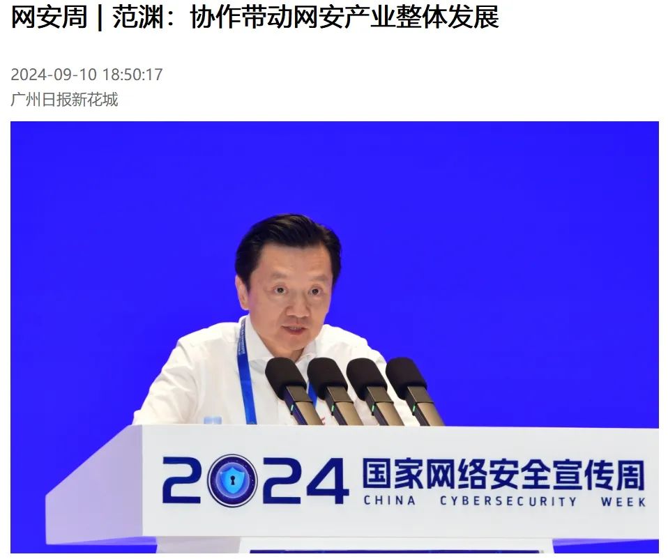 2024网安周主论坛安恒信息董事长范渊发表主题演讲,广州日报、新华网、南方都市报、经济参考报等多家媒体报道。